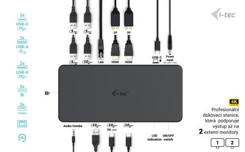 Univerzální dokovací stanice i-tec Thunderbolt 3 Professional Dual 4K, která je díky bohaté nabídce konektorů kompatibilní s notebooky, tablety externími monitory apod. Podporuje vysoký výkon až 1000 W Power Delivery, díky čemuž je vhodná pro profesionální použití.