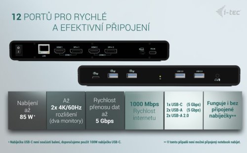 Dokovací stanice umožňuje připojit notebook, tablet nebo smartphone k dalším monitorům a hardwaru. K počítači či notebooku se připojuje pomocí USB-C portu s podporou Thunderbolt 3/4 a USB4. Na podporovaných zařízeních je tak schopná přenášet i napájení až 85 W. K dokovací stanici je možné připojit dva 4K monitory při 60 Hz. Vysokorychlostní přístup k internetu lze realizovat skrze přítomný RJ-45 port. Pro připojení periférií jsou přítomny dva USB-C, dva USB 2.0 a dva USB 3.0 porty. Dokovací stanici lze nainstalovat i dozadu za monitor s podporou VESA uchycení díky VESA držáku (není součástí), čímž získáte jak maximální pracovní efektivitu díky rozšiřitelnosti portů, tak i krásně uklizený stůl bez kabelů. Potěší také slot pro bezpečnostní zámek a vypínač dokovací stanice pro maximální úsporu elektrické energie.