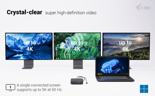 I-TEC USB-C DP Dual HDMI Dock podporuje připojení až 3 externích monitorů s rozlišením 4K nebo jednoho monitoru s dechberoucím rozlišením 5K/60 Hz. Výrazně tak rozšiřuje pracovní plochu a je vhodný pro grafickou práci, analytiku a všechny činnosti náročné na detailní zobrazení.