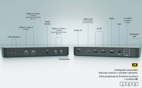 Dokovací stanice podporuje připojení až tří externích monitorů v rozlišení až 4K a je kompatibilní s notebooky vybavenými porty USB-C, USB4 nebo Thunderbolt™ 3/4/5. Nabízí celkem 6 USB portů, včetně rychlých USB-C a USB s podporou Gen 2 (10 Gb/s), gigabitový Ethernet a Power Delivery až 100 W pro nabíjení vašeho notebooku nebo tabletu.