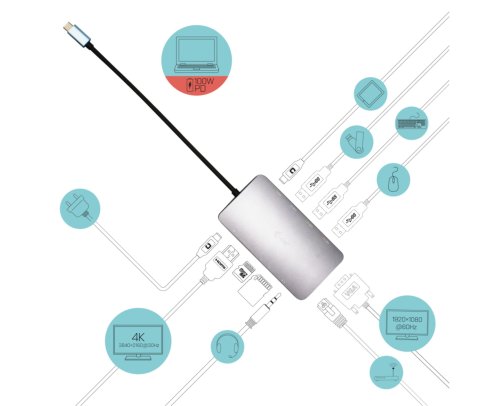 Dokovací stanice v kovovém provedení nabízí velké množství praktických portů. K počítači či notebooku se připojuje pomocí USB-C portu s podporou Thunderbolt 3/4 a je tak schopná na podporovaných zařízeních přenášet i napájení až 100 W. Vysokorychlostní přístup k internetu lze realizovat skrze přítomný RJ-45 port. K dokovací stanici lze připojit také monitor skrze rozhraní HDMI nebo VGA. Pro připojení periférií jsou přítomny tři USB 3.0 porty a jeden USB-C port. Mimo to je k dispozici i čtečka microSD a SD karet. Pro připojení sluchátek či mikrofonu pak slouží kombinovaný 3,5 mm konektor.