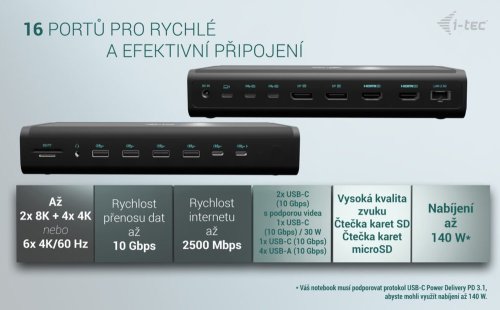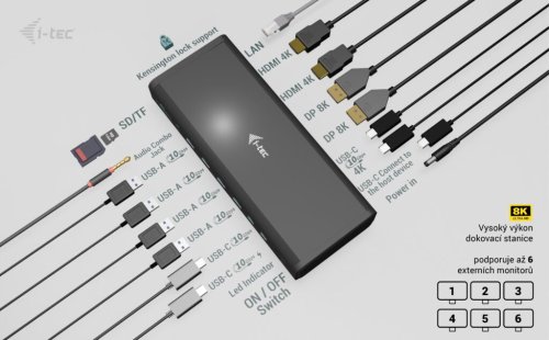 I-TEC Universal 6× 4K Display Docking Station 140 W podporuje připojení až 6 monitorů, díky čemuž bezprecedentně rozšíří vaši pracovní plochu. Podporuje maximální rozlišení 8K u dvojice monitorů, případně 6 monitorů v rozlišení 4K. Dokovací stanice je kompatibilní s celou řadou moderních notebooků skrze porty USB-A, USB-C, Thunderbolt 3 nebo 4, a dokonce USB4.