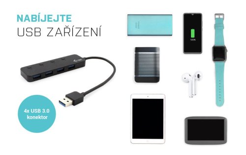 Stylový a kompaktní USB hub umožňuje připojit až čtyři USB zařízení do jednoho USB 3.0 konektoru počítače. Hlavní výhodou je možnost zapínat a vypínat jednotlivé USB porty a tím dosáhnout maximálních rychlostí u aktivních portů. USB hub je vybaven také micro USB portem pro připojení volitelného napájecího adaptéru s výkonem až 10 W (není součástí balení). Podporuje širokou škálu operačních systémů od Windows a Mac OS až po Linux.
