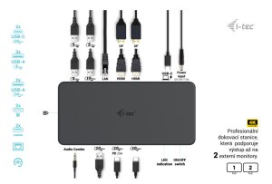 • Profesionální univerzální dokovací stanice, kompatibilní s notebooky a tablety s rozhraním USB-C, USB-A a Thunderbolt. • 2x DisplayPort a 2x HDMI podporující až dva displeje 4K/60Hz (platí i pro platformu Apple M1/M2) nebo jeden displej 5K/60Hz. • 7x USB portů včetně 2x USB-C Gen 2 (1x s podporou 20W PD nabíjení a jeden s podporou rychlého nabíjení BC 1.2) a 5x USB-A 3.2 (2x Gen 2 a 3x Gen 1), což usnadňuje připojení více USB zařízení a periferií pro superrychlý přenos dat. • Poskytuje až 100W Power Delivery pro kompatibilní notebooky a tablety s rozhraním USB-C a Thunderbolt. Hostitelské zařízení musí podporovat USB-C Power Delivery. • GLAN Ethernet podporuje síťové rychlosti 10/100/1000 Mb/s, čímž poskytuje robustní a vysokorychlostní připojení k internetu. • Kombinovaný vysoce kvalitní 32bit/192 kHz 3,5 mm audio vstup a výstupní konektor pro snadné připojení náhlavní soupravy nebo reproduktorů. • K dispozici držák VESA, který vám pomůže udržet pořádek na stole bez kabelů, a slot K-lock pro větší bezpečnost.