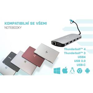 Výkonná, přesto však malá a přenosná dokovací stanice, která podporuje výstup až na tři externí monitory. Dok lze použít prakticky s jakýmkoliv notebookem, neboť podporuje připojení ke všem obvyklým portům: USB 3.0, USB-C, USB4 a Thunderbolt“ 3/4, a zároveň podporuje všechny běžné současné operační systémy. Připojení ke třem monitorům však bude možné pouze v případě notebooku s portem Thunderbolt“ 3/4, případně USB-C portem podporujícím přenos videa (tzv. USB-C DP Alt mode).