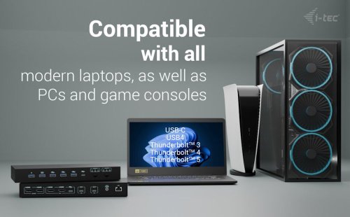Je plně kompatibilní se všemi notebooky vybavenými porty USB-C, USB4 nebo Thunderbolt 3/4/5. PC nebo herní konzoli lze připojit přes 1–2× HDMI a USB.