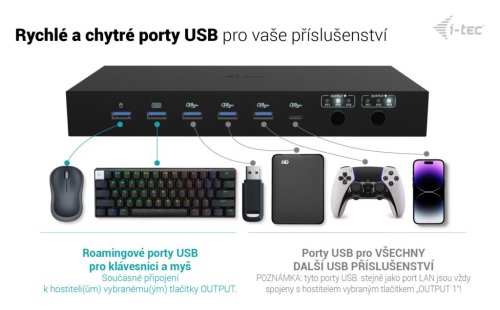 Unikátní funkce USB roaming umožňuje sdílení dvou vyhrazených USB portů pro klávesnici a myš mezi dvěma hostiteli současně, což zajišťuje maximální efektivitu a pohodlí při přepínání mezi zařízeními.