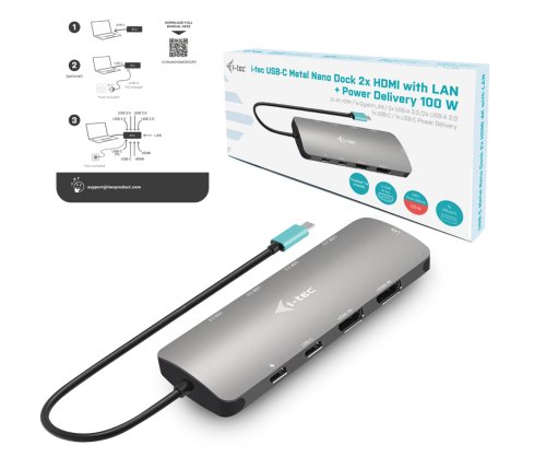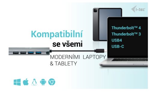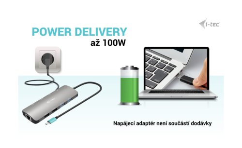 Dokovací stanice podporuje až 100W napájení připojeného notebooku nebo tabletu (nabíječka USB-C není součástí dodávky)