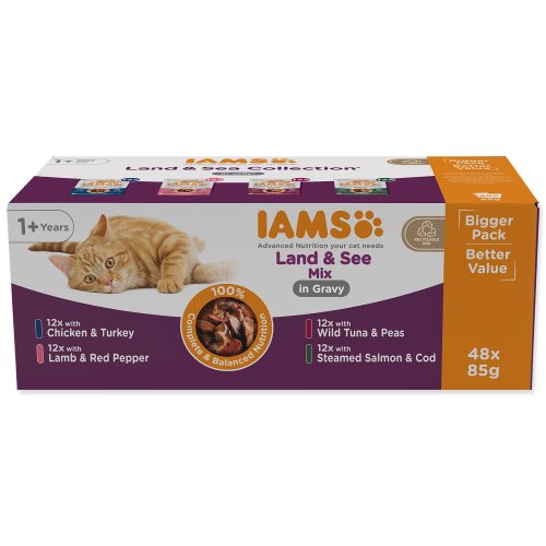 4 druhy kapsiček IAMS po 12 kusech.