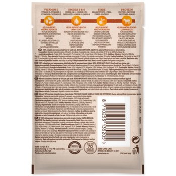 Maso a živočišné deriváty, ryby a rybí deriváty (4% losos), deriváty zeleninového původu (0,5% řepná vláknina), minerály, oleje a tuky (0,1% rybí olej, 0,05% slunečnicový olej.
