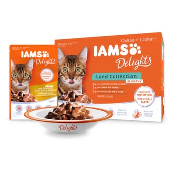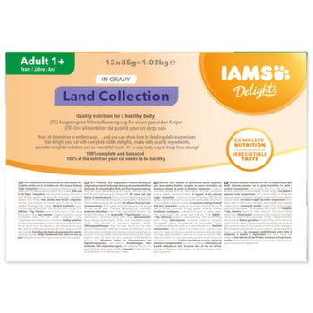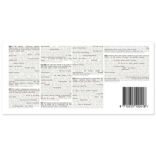 Složení: maso a živočišné deriváty (4% jehněčí maso), zelenina (4% sušené papriky), deriváty zeleninového původu, minerály. Jakostní znaky: hrubé proteiny 9,2%, vlhkost 79,3%, hrubé oleje a tuky 4,8%, hrubé popeloviny 1,4%, hrubá vláknina 0,4%, vitamín D 200 m.j./ kg, vitamín E (alfatokoferol) 100 mg / kg, měď (síran měďnatý pentahydrát) 1,8 mg / kg, jód (jodid draselný) 0,37 mg / kg, mangan (síran manganatý monohydrát) 2,1 mg / kg, zinek (síran zinečnatý monohydrát) 32 mg / kg. Bez barviv a příchutí.