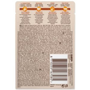 Kompletní vlhké krmivo s jehněčím masem v lahodné omáčce pro starší kočky od 7 let.vysoce stravitelnébez sóji, pšenice, umělých barviv, dochucovadel a koncentrovaných bílkovin na rostlinné bázikvalitní bílkoviny - správné osvalenířepné řízky a jablečné výlisky - obsah vlákniny pro správné tráveníomega 3 a 6 mastné kyseliny - zdravá a lesklá srst a kůževitamín E - podpora imunity Složení:Maso a živočišné deriváty, ryby a rybí deriváty (4% losos), deriváty zeleninového původu (0,5% řepná vláknina), minerály, oleje a tuky (0,1% rybí olej, 0,05% slunečnicový olej.Doplňkové látky:Vitamín D3: 250IU, vitamín E: 150 mg / kg.Stopové prvky:síran manganatý monohydrát (E5 - Mn): 2,2 mg / kg, síran zinečnatý monohydrát (E6 - Zn) 33,5 mg / kg.Analytické složky:Hrubé proteiny: 9,3%, hrubé oleje a tuky: 5,1%, hrubé popeloviny: 1,8%, hrubá vláknina: 0,4%, vlhkost: 79,3%. Denní dávkování:Starší kočku s hmotností 4 kg krmte denně 2,25 až 3,5 kapsičkami.