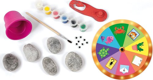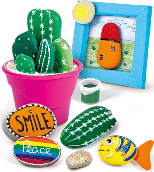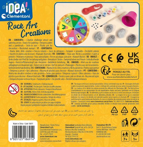 Zábavná kreativní sada Clementoni IDEA na výrobu barevných kamínků. Popusťte uzdu fantazii a tvořte. Kameny různých tvarů a velikostí můžete zdobit pomocí temperových barev a nalepovacích očí. Kolečko s kreativním výběrem výzev zapojuje dítě do hry a vybízí ho k vytváření malých kamenných kompozic, které lze zdobit temperovými barvami. Podněcuje kreativitu, představivost a zručnost. Obsahuje: kameny, temperové barvy, štětec, plastový kelímek, nalepovací oči, kartonové kolečko se šipkou, obrázkový návod.