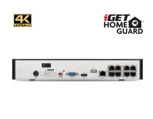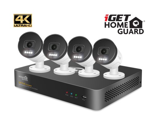 Kamerový systém iGET HOMEGUARD HGNVK88504 s rozlišením Ultra HD 4K (3840 x 2160), obousměrným přenosem zvuku, barevným nočním viděním, sirénami, PoE napájením a SMART detekcí pohybu. 8-kanálový 4K rekordér NVR s PoE napájením + 4x HGNHK938CAM 4K (8MPx) PoE barevná venkovní kamera s LED svícením a výstražnými LED, myš, kabeláž, pozice pro 1x HDD SATA až 10 TB, podpora ONVIF ver.2.6, Google Assistant, Amazon Alexa.