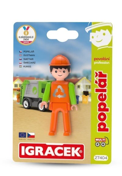 Oblíbená dětská profese – Popelář, který se stará o čisté město. Kompatibilní s auty MultiGO. Hra s Igráčky podporuje dětskou představivost, kreativitu, rozvíjí jemnou motoriku. Legendární postavička od roku 1976. Figurka bez příslušenství. Vyrobeno v ČR.