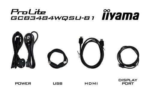 Obsah balení: napájecí kabel (1.85 m), USB kabel (1.5 m), HDMI kabel (1.85 m), DisplayPort kabel (1.85 m), uživatelský manuál, instrukce bezpečnosti
