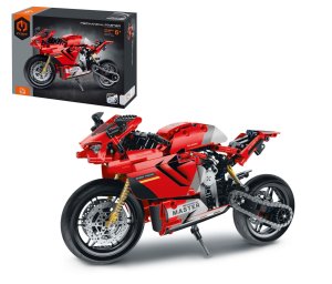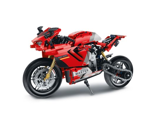 iM.Master Stavebnice motorka červená. Rozměry 32,2x10x16,6 cm. 557 dílků. Otáčecí zadní kolo s řetězem, fungující zadní tlumič.
