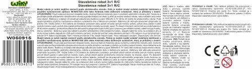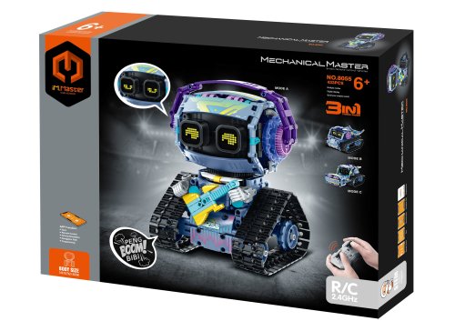 iM.Master Stavebnice robot s kytarou 3v1 RC na dálkové ovládání. Rozměry 14x15,7x21,6 cm. 433 dílků. Ovládání ovladačem nebo smartphonem. Frekvence 2.4GHz. Bluetooth propojení s mobilem. Aplikace pro iOS a Android. Světelné a zvukové efekty. Bateriový pack 300mah 7.4V lithium do robota součástí, 2xAA do ovladače nejsou součástí. USB kabel součástí. Přepínač ON/OFF na ovladači a bateriovém boxu robota.