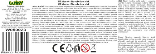 iM.Master Stavebnice vlak červený s auty. Rozměry vlaku 53,6x12x6 cm, železnice 123x71,8 cm. 617 dílků. Vestavěný bateriový pack 400mAh 3.7V lithium do vlaku součástí. Nastavení rychlosti jízdy vlaku, změna směru jízdy dopředu a dozadu. Přepínač ON/OFF. Kolečko pro nastavení směru jízdy na střeše vlaku. USB nabíjecí kabel součástí.