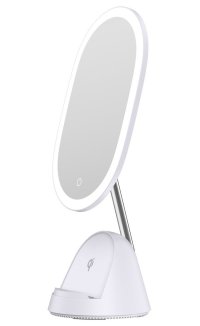 Stolní kosmetické zrcadlo s LED podsvícením je dokonalý pomocník nejen při líčení. 28 vestavěných LED diod neoslňuje ani nezkresluje barvy a jeho oválný tvar komfortně zobrazí celý obličej i oblast krku. Navíc jej lze naklánět v rozsahu 40°, takže vám už neunikne žádný detail. Intenzitu podsvícení je možné nastavit ve třech úrovních pomocí dotykového tlačítka na přední straně zrcadla. Dále nabídne praktický stojánek pro mobilní telefon s bezdrátovou nabíječkou standardu Qi, která poskytuje výkon až 10 W.