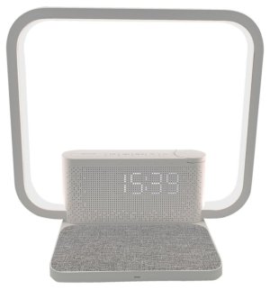 Multifunkční LED stolní lampa kombinující osvětlení, budík, bezdrátové nabíjení a relaxační zvuky v jednom elegantním zařízení.