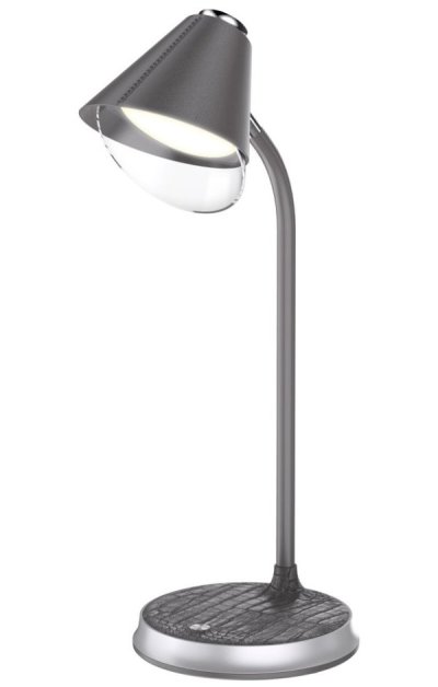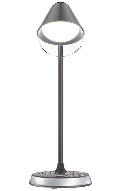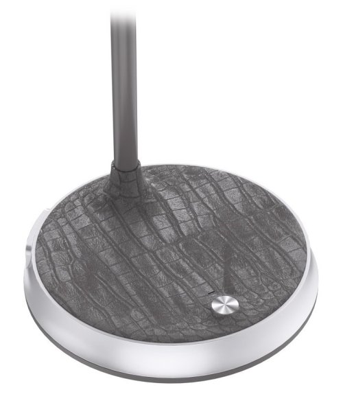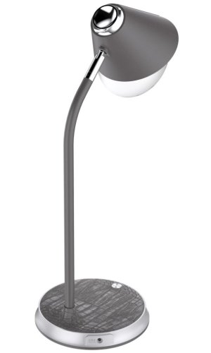 Praktická stolní lampička s pokročilou LED technologií, naklápěcí hlavou a nadčasovým designem. Šedá imitace kůže v kombinaci se stříbrnými prvky z ní dělá také stylový vizuální doplněk, vhodný například do reprezentativních kancelářských prostor. Nastavení intenzity osvětlení i barevné teploty probíhá pomocí jediného dotykového tlačítka. Lampička je vybavena také bezdrátovou nabíječkou standardu Qi nabízející výkon 10 W. Mobilní telefon s podporou bezdrátového nabíjení se začne nabíjet při pouhém položení na nabíjecí plochu.