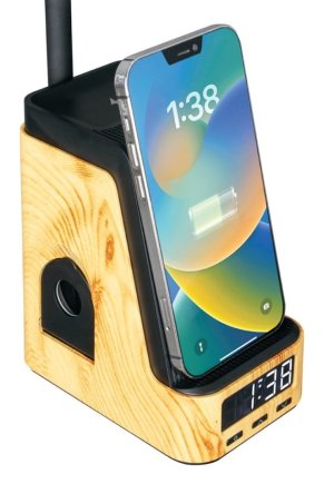 Moderní stolní lampa kombinuje kvalitní osvětlení s praktickou nabíjecí funkcí pro telefony, sluchátka a chytré hodinky. Elegantní design v dekoru světlého dřeva s černými prvky dokonale doplní moderní pracovnu, ložnici nebo dětský pokoj.
