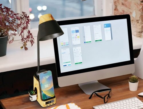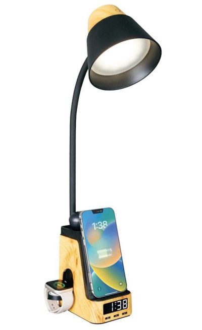 Stylová LED stolní lampa s integrovanou bezdrátovou nabíjecí stanicí Qi 3 v 1 pro mobilní zařízení.