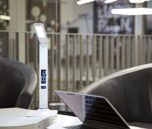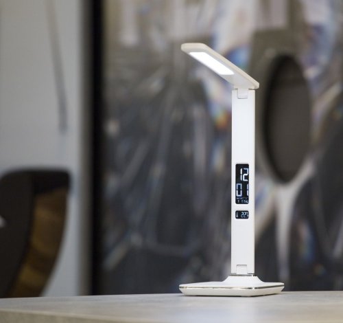 LED stolní lampička v moderním designu se sklápěcím ramenem a informačním panelem, který zobrazuje údaje o aktuálním času, datu a teplotě. Nabídne také dotykové ovládání jasu. Vestavěný USB port se postará o nabíjení vašeho telefonu nebo jiného USB zařízení. Součástí balení je síťový adaptér.