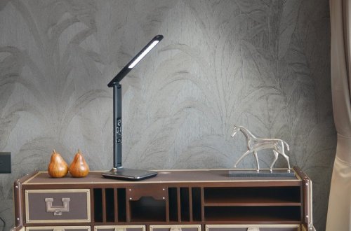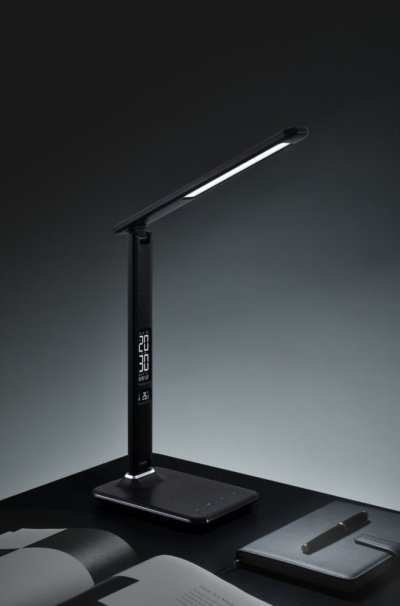 LED stolní lampička v moderním designu se sklápěcím ramenem a informačním panelem, který zobrazuje údaje o aktuálním času, datu a teplotě. Nabídne také dotykové ovládání jasu. Vestavěný USB port se postará o nabíjení vašeho telefonu nebo jiného USB zařízení. Součástí balení je síťový adaptér.