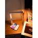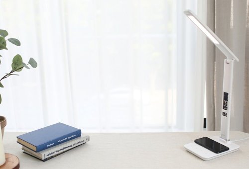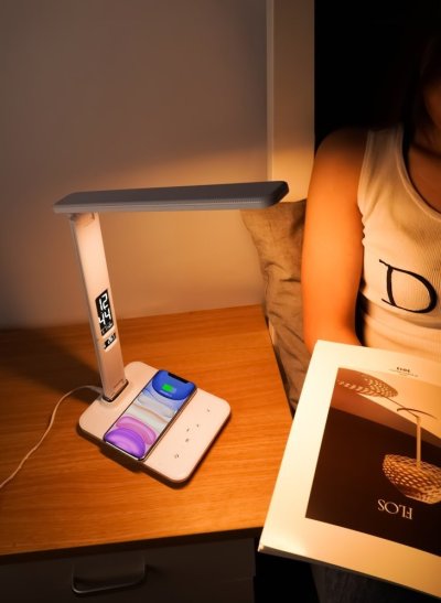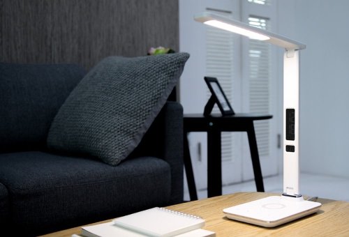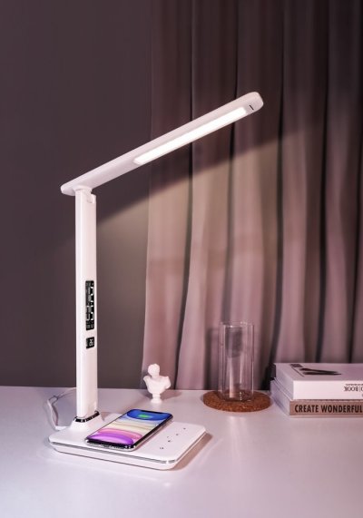 LED stolní lampička s designem imitace bílé kůže „s prošíváním“, sklápěcím ramenem a informačním panelem, který zobrazuje údaje o aktuálním času, datu, teplotě a budíku. Nabídne také dotykové ovládání úrovně jasu a barvy světla. Lampička je vybavena bezdrátovou nabíječkou standardu Qi a nabíjecím USB portem. Mobilní telefon s podporou bezdrátového nabíjení se začne nabíjet při pouhém položení na nabíjecí plochu.