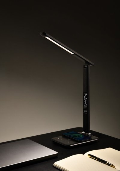 LED stolní lampička s designem imitace černé kůže „s prošíváním“, sklápěcím ramenem a informačním panelem, který zobrazuje údaje o aktuálním času, datu, teplotě a budíku. Nabídne také dotykové ovládání úrovně jasu a barvy světla. Lampička je vybavena bezdrátovou nabíječkou standardu Qi a nabíjecím USB portem. Mobilní telefon s podporou bezdrátového nabíjení se začne nabíjet při pouhém položení na nabíjecí plochu.