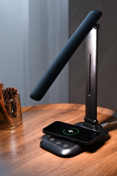 Multifunkční LED stolní lampa s integrovaným bezdrátovým nabíjením a USB výstupem pro moderní domácnost i kancelář.