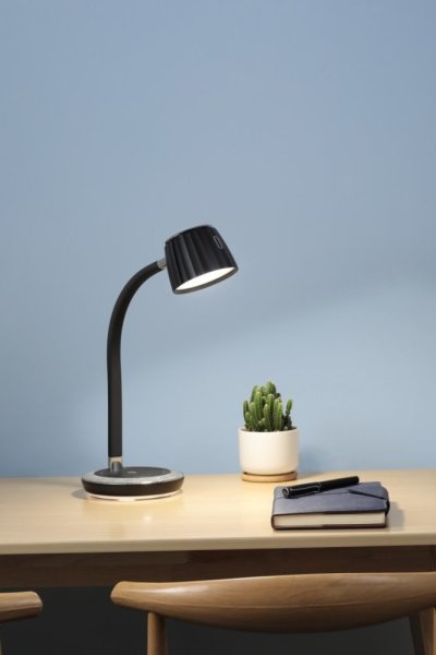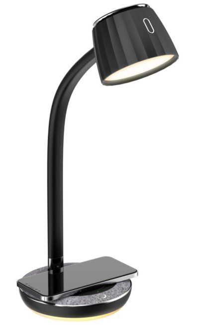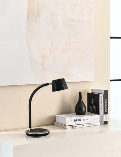 Multifunkční LED stolní lampička s integrovaným bezdrátovým nabíjením Qi a flexibilním designem.