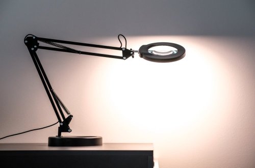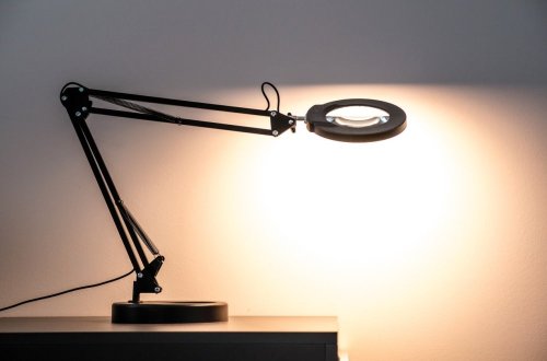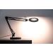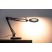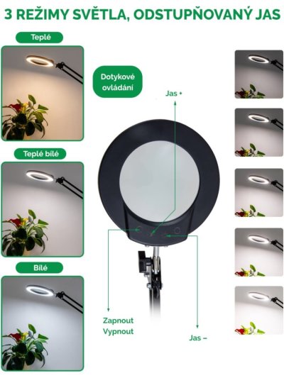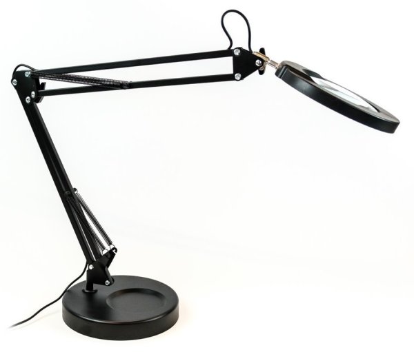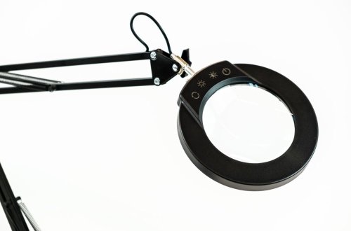 Stmívatelná stolní LED lampička se zvětšovací skleněnou čočkou vhodná do dílen, kosmetických salonů, kanceláří atd. Lampu lze postavit na plochu nebo pevně upevnit kovovou svorkou na okraj stolu. Disponuje flexibilním ramenem o délce 70 cm a natáčecí hlavou ve všech směrech, což umožňuje perfektní nastavení osvětlení při práci. Ovládání lampičky je velmi snadné díky dotykovým tlačítkům. Dostatečný průměr lupy (skla) o velikosti 10 cm umožňuje efektivní práci s lupou.