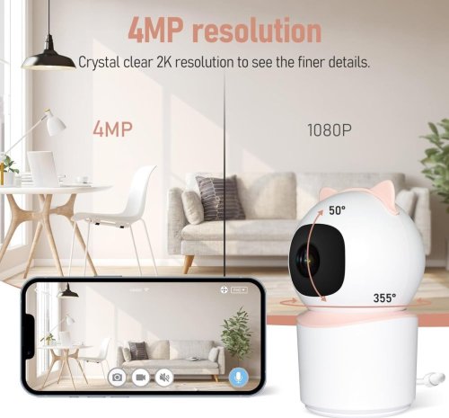 Chytrá vnitřní bezpečnostní kamera do dětského pokoje disponuje otočným mechanismem pro monitorování v zorném úhlu 360°. Snímač nabízí rozlišení 4 Mpx a je schopný snímat video v rozlišení 2560 × 1440 bodů. Pro případ zhoršených světelných podmínek je přítomen IR přísvit do vzdálenosti až 5 m. Součástí kamery je integrovaný reproduktor a mikrofon, který umožní kvalitní oboustrannou komunikaci. Připojení lze jednoduše realizovat bezdrátově skrze Wi-Fi. Propojení kamery pomocí aplikace v mobilním zařízení umožní pohodlný vzdálený přístup, ovládání kamery, pořizování záznamů či fotografií. Natočené záznamy je možné ukládat i na microSD kartu do kapacity až 128 GB. Mezi další užitečné funkce patří například detekce pláče, integrovaný teploměr a vlhkoměr nebo přehrávání pěti různých ukolebávek. Je také kompatibilní s inteligentními hlasovými asistenty Amazon Alexa, Google Assistant a Apple Siri.