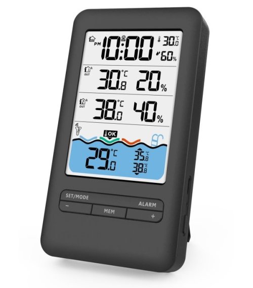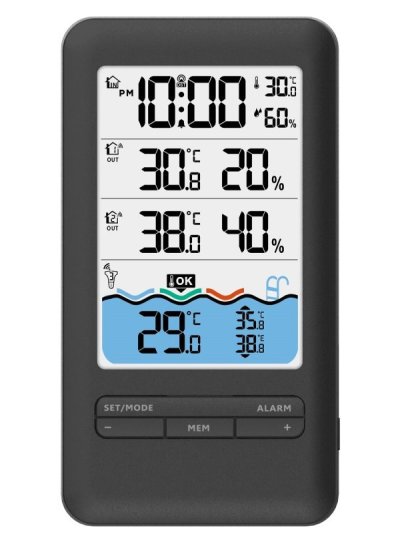 Součástí balení je vnitřní stanice, 1× bazénové čidlo, 2× čidlo teploty a vlhkosti a napájecí kabel.
