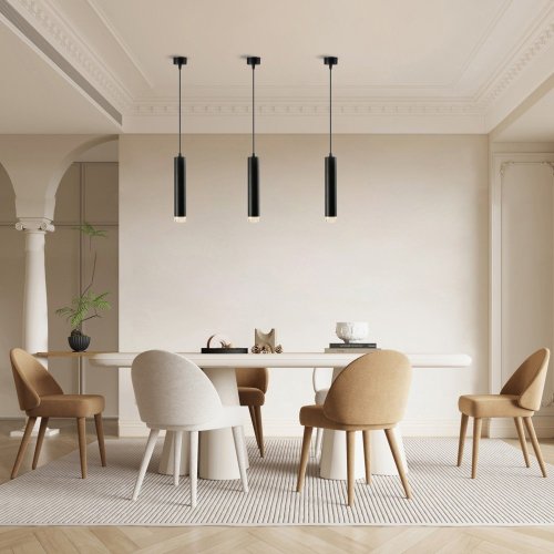 Závěsné bodové svítidlo PUNTO představuje kvalitní kovové svítidlo v elegantním, matně černém provedení s akrylátovými prvky, které je ideální volbou pro funkční osvětlení současných interiérů. Kovová hlava je zavěšena na nastavitelném závěsu o délce až 100 cm, umístěném na kulaté základně o průměru 6 cm. Osazeno je paticí GU10 pro instalaci žárovky o max. příkonu 9 W. Hlavu svítidla lze pro snadnější instalaci žárovky odšroubovat.