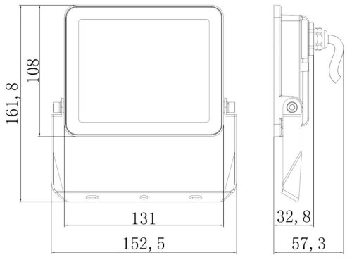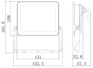 Kompaktní rozměry 131 × 108 × 57 mm bez držáku a hmotnost 310 g usnadňují montáž. Reflektor pracuje se standardním síťovým napětím AC 230 V a nevyžaduje žádné speciální napájecí zdroje.