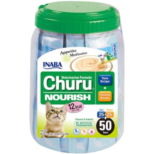 Podpora apetitu a příjmu krmiva a vody. Veterinární varianta pochoutek Churu je přírodní, velmi chutné pyré, které zvyšuje chuť k jídlu a pomáhá kočičím pacientům při rekonvalescenci. Churu má vysoký obsah vody, je dostupné ve dvou kalorických verzích a produkované v továrnách s GMP/HACCP certifikáty. Churu je speciálně vytvořené vysoce chutné pyré, které zvyšuje chuť k jídlu a pomáhá kočkám v rekonvalescenci. Stres a inapetence jsou největším strašákem během hospitalizace koček, ale díky podávání pamlsků Churu Nourish nebo Churu Diet, budou vaši kočičí pacienti ve větší pohodě. Churu Nourish – skvělá chuť a vhodná konzistence navnadí kočičí pacienty a zlepší inapetenci (12 kcal v jedné tubě). Složení – kuřecí recept: kuře 38,5 %, tapioka (sušená), výtažek z kuřete, výtažek ze zeleného čaje. Analytické složky: bílkovina 8,5 %, obsah tuku 5,5 %, surová vláknina 0,1 %, surový popel 1,5 %, vlhkost 83 %. Nutriční přísady: taurin 700 mg, vitamín E (3a700) 566 mg. Technologické přísady: guarová guma (E412) 7,1 g. Senzorické přísady: dochucovadla. Metabolizovatelná energie: 940 kcal/kg. Složení – tuňákový recept: tuňák 30 %, kuře, tapioka (sušená), výtažek z tuňáka, výtažek ze zeleného čaje. Analytické složky: bílkovina 9 %, obsah tuku 5 %, surová vláknina 0,1 %, surový popel 1,5 %, vlhkost 83 %. Nutriční přísady: taurin 700 mg, vitamín E (3a700) 566 mg. Technologické přísady: guarová guma (E412) 9 g. Senzorické přísady: dochucovadla. Metabolizovatelná energie: 900 kcal/kg. Krmný návod: Tento produkt je určen pouze pro občasné nebo doplňkové krmení. Používejte pouze dle pokynů veterináře. Po otevření dejte chladit a podávejte co nejdříve. Balení: 50 ks.