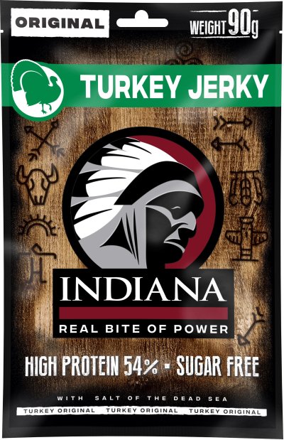 Pro sportovce nebo zdatného výletníka není zdravější, rychlejší a výživnější svačinky než sáček Indiana Jerky z krůtího sušeného masa. Je to lehká, na dotek nemastná pochoutka, která obsahuje 54 % proteinů a jen minimum tuku. Jedná se o náčelníkovu originální recepturu s nezaměnitelnou evropskou slanou chutí masa.