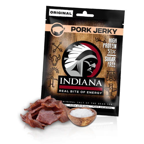 Jerky obecně označuje syrové maso, ze kterého je odstraněn tuk a následně je nakrájeno a vysušeno. Indiana Jerky jako takové pak náš náčelník vyrábí podle starých indiánských receptur. Indiana Jerky jsou tence nakrájené plátky libového masa, dále marinované, sušené a zauzené. Sušení probíhá několik hodin tak, aby si výchozí surovina zachovala jak přirozenou chuť masa, tak svou šťavnatost a pružnost. Pro sportovce nebo zdatného výletníka není zdravější, rychlejší a výživnější svačinky než sáček Indiana Jerky. Je to lehká, na dotek nemastná pochoutka, která obsahuje vysoké množství proteinů a jen minimum tuku. Pro výrobu byl zvolen závod, jež splňuje nejpřísnější hygienické normy. Přednosti: