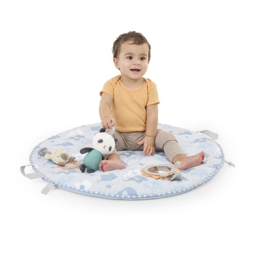 5 odnímatelných hraček: silikonový lístek, plyšová panda, dřevěný kroužek, zrcátko s lvíčkem a chrastítko se žirafou
