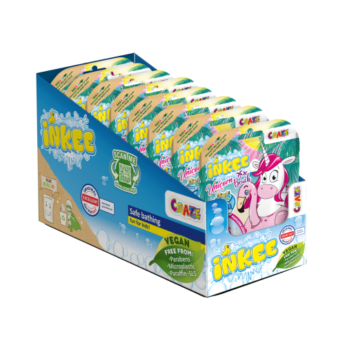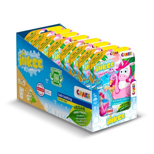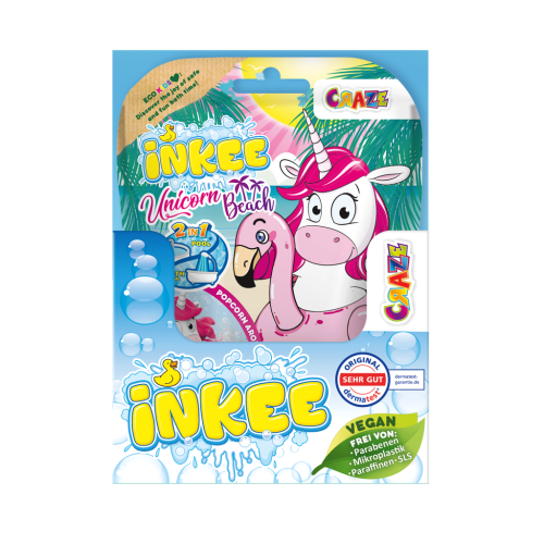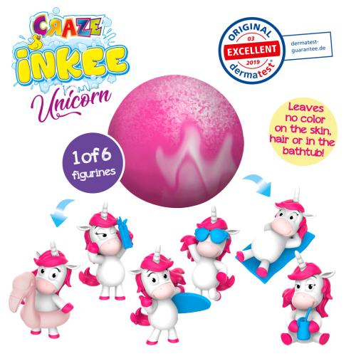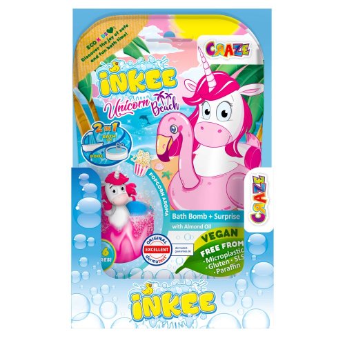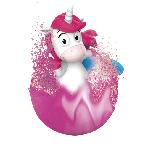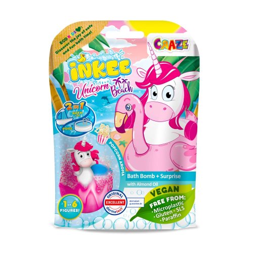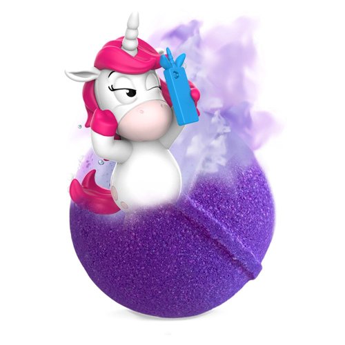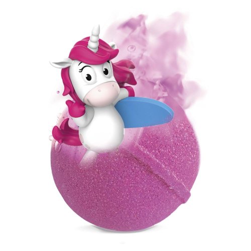 Růžová, nebo fialová šumivá bomba do koupele s překvapením a vůní skladkého popcornu. Téma překvapení: Pláž