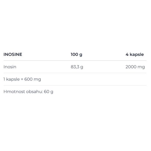 Inosin je látka tělu vlastní, vyhledávaná sportovci pro efektivnější využití kyslíku při zátěži, energetickou stimulaci a zvýšení fyzické i psychické výkonnosti. Podpora výkonu. - 500 mg inosinu v jedné kapsli - praktické balení v kapslích Doporučené dávkování produktu INOSINE: užijte 2 – 4 kapsle 30 min. před fyzickou zátěží, maximálně 4 kapsle za den. Zapijte dostatečným množstvím vody. Nepřekračujte doporučené dávkování. Upozornění: Doplněk stravy. Nenahrazuje pestrou stravu. Není určeno pro děti, těhotné a kojící ženy. Ukládejte mimo dosah dětí! Chraňte před teplem, mrazem a vlhkostí. INOSINE - složení: inosin, želatinová tobolka (želatina, barvivo oxid železa). Dodavatel: NUTREND D.S., a.s., Chválkovice 604, 779 00 Olomouc, Česká republika