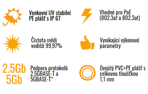 Kategorie: CAT5E Podporované protokoly: 2.5/5GBASE-T a nižší Stínění: fólie kolem všech 4 párů Šířka pásma: 100 MHz Typ a velikost vodiče: měděný drát 0,50 mm ± 0,005 mm Izolace a průměr vodiče s izolací: HDPE 1,0 mm Třída reakce na oheň; typ pláště: Fca; PVC+PE Barva pláště: šedá RAL 7035 (vnitřní plášť), černá RAL 9005 (vnější plášť) Průměr kabelu: 7,4 mm Váha: 53,1 kg/km NVP: 68 % Propagation delay: 535 ns/100 m Delay skew: 20 ns/100 m Skladovací teplota: -20 °C až 70 °C Provozní teplota: -20 °C až 70 °C Teplota při instalaci: 0 °C až 50 °C Balení: 305 m, dřevěná cívka Rozměry balení (průměr x výška): 380 mm x 240 mm Počet balení na paletě: 45 cívek (velká paleta), 36 cívek (malá paleta)