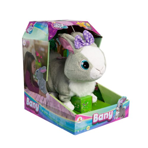 Interaktivní, plyšový králíček Bany. Bany reaguje na zvuky pohybem a hýbáním ušima. Ale bud opatrný/á, pokud budeš na Bany volat príliš potichu. Nebo ji zmateš prílišným hlukem, vyděsí se a nebude reagovat. Výrobek vyžaduje 3X AA baterie a je vhodný pro děti od 18 měsíců. Králíček je dodáván s fialovou nebo růžovou mašlí. Barvu nelze vybrat, zasíláme náhodným výběrem.
