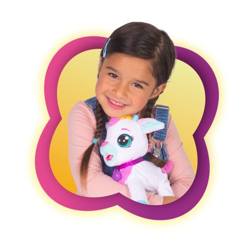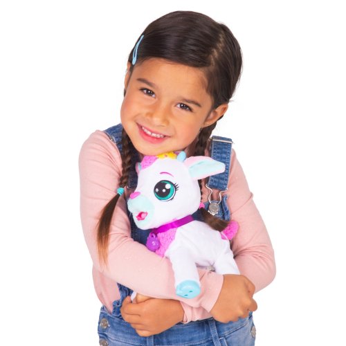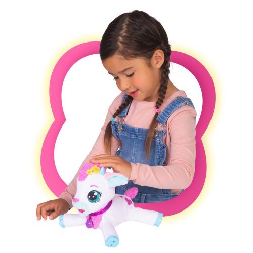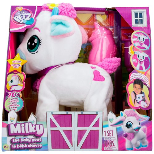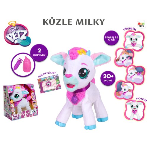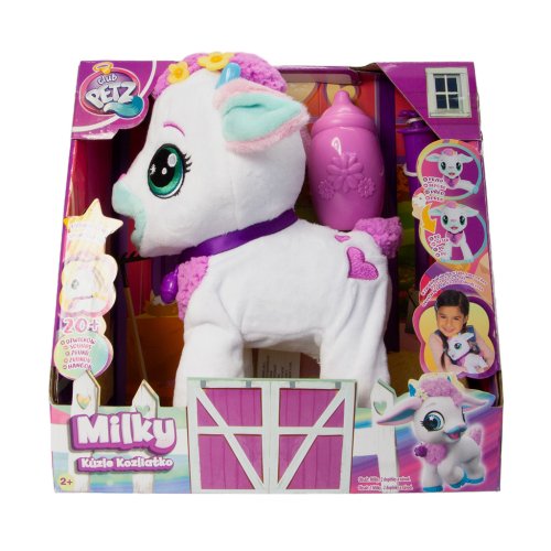 Interaktivní kůzlátko Milky. Milky vydává až 20 různých zvuků. Hezky se o ní postarej, hlaď ji po hlavě, naočkuj ji, nakrm ji. Ona se postaví na všechny čtyři. Balení obsahuje: 1 plyšáka, 1 lahvičku, 1 injekci, 1 letáček, 1 návod. Výrobek vyžaduje 3 AG13 baterie, které jsou součástí výrobku. Pro děti od 2 let.