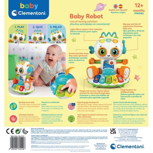 Clementoni Baby Robot je zábavný robot s motorem se spoustou elektronických a mechanických aktivit, které umožňují malým dětem rozvíjet jemnou motoriku, logické myšlení a koordinaci pohybů. Se svým nejnovějším malým kamarádem si užijete skvělý čas. Když pohnete pákou na hlavě, robot změní svůj „výraz tváře“ a herní režim. K dispozici jsou 3 herní režimy, vzdělávání, kvíz a spánek, každý se samostatnými funkcemi pro zábavné chvíle! Stisknutím tlačítek se můžete naučit jména zvířat, barvy a mnoho nových slov. Výběrem režimu kvízu bude dětský robot prezentovat jednoduché hádanky k vyřešení, čímž pomůže dětem rozvíjet jejich kognitivní schopnosti. Ve vzdělávacím a kvízovém režimu se dětský robot Clementoni pohybuje, hraje melodie a písně, čímž upoutává pozornost dětí. V režimu spánku je pohyb robota deaktivován, děti baví písničkami a říkankami. Mnohé funkce jsou doprovázeny zábavnými světelnými efekty. Robot funguje na baterie 3 x AA, které jsou součástí balení pouze pro demonstrační účely. Jazykové mutace: CZ/SK/HU. Rozměry balení: 32 x 30 x 20 cm. Věk: 12 m+