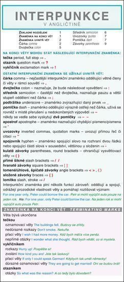 Koncentrovaný přehled sumarizuje učební látku – znaménka rozdělení, znaménka na konci vět, znaménka uvnitř vět. Přehledné členění, grafická úprava a volba barev umožňuje rychlou orientaci v textu a snadnější zapamatování.
